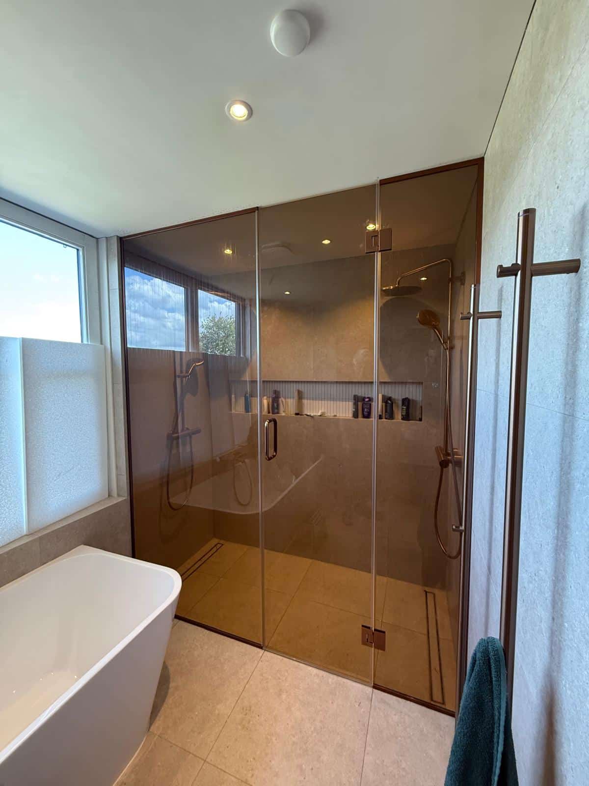 Recent opgeleverd: een adembenemende dubbele douche met maatwerk glas dat voorzien is van een prachtige kleurbewerking! De warme, bronzen gloed van het glas creëert een intieme en luxe walk-in ervaring.